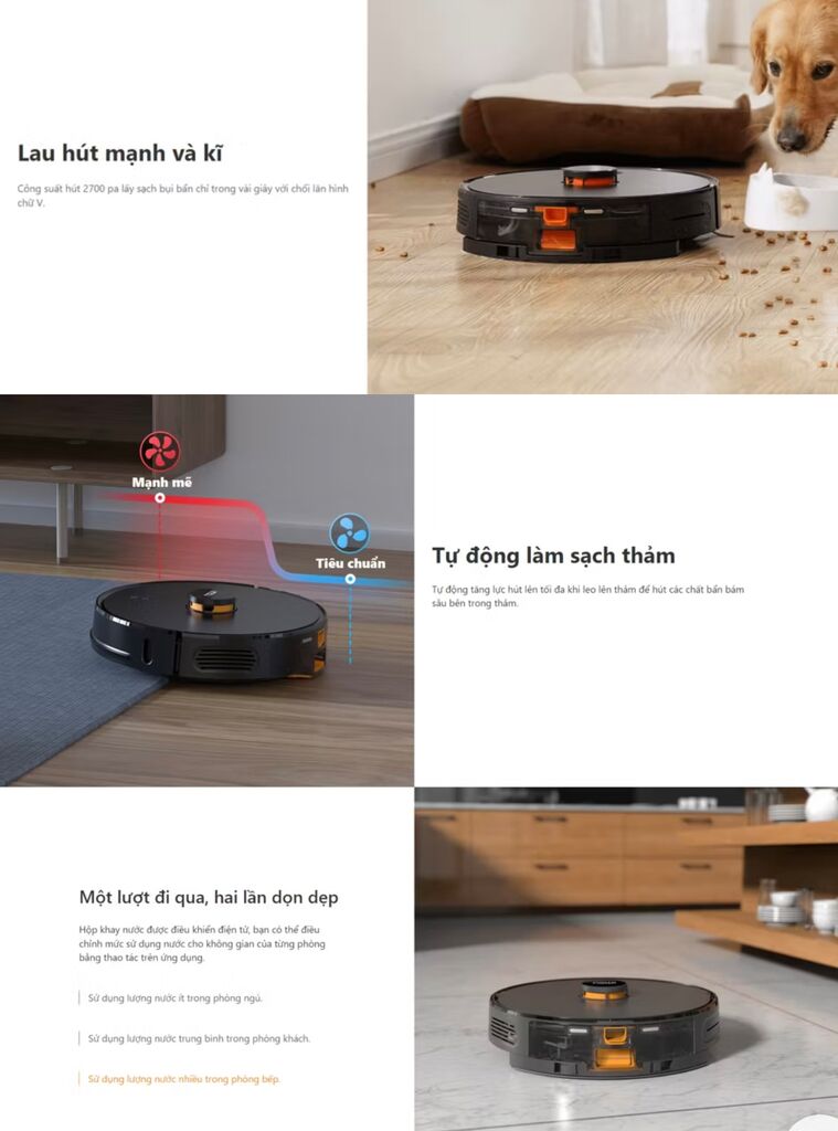 – Công nghệ 3 trong 1: Bao Gồm vừa quét, hút bụi và lau trong cùng 1 lần chạy