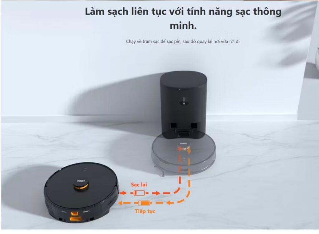 – Tự động quay về trạm sạc: Nếu pin xuống thấp sẽ trở lại được sạc sau đó tiếp tục hoạt động