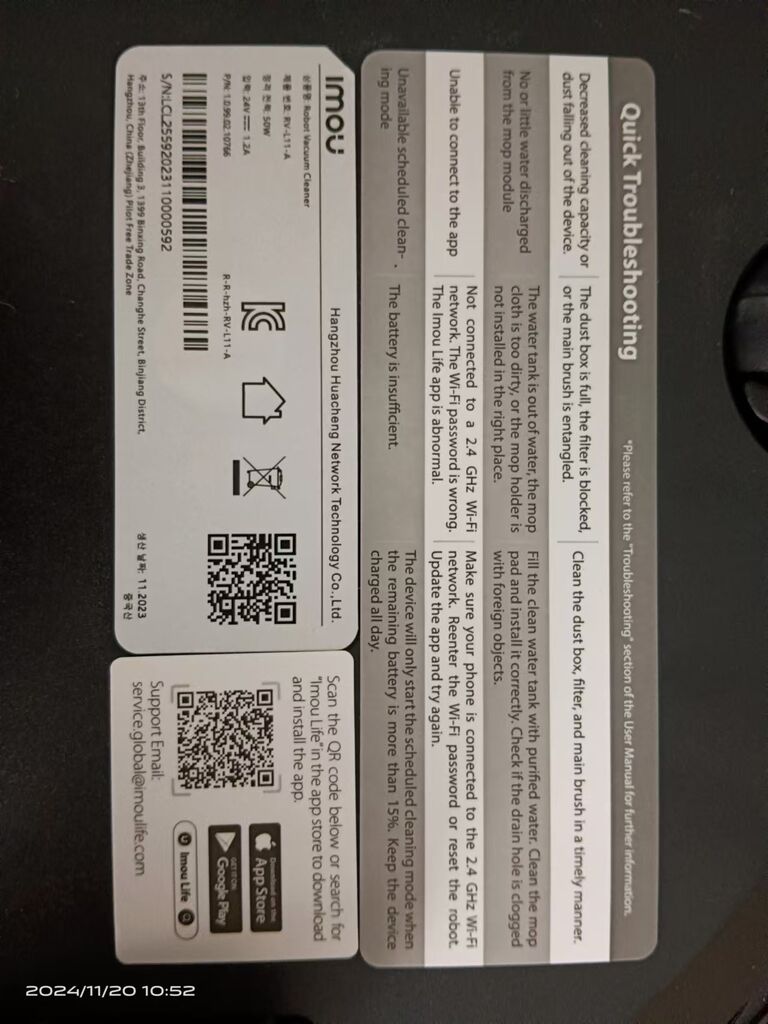 Thông số kỹ thuật Robot hút bụi thông minh IMOU RV-L11-A