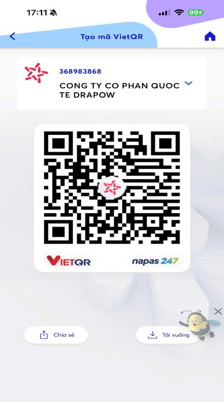 - Bước 4: Quý khách chuyển tiền vào tài khoản của CÔNG TY CỔ PHẦN QUỐC TẾ DRAPOW qua STK ngân hàng hoặc mã QR.